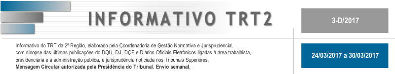 Segundo relata o Juiz Convocado Paulo Kim Barbosa em acórdão da 12ª Turma do Tribunal Regional do Trabalho da 2ª Região: “Agravo de petição. Impenhorabilidade da pensão por morte. A pensão por morte é efetivamente protegida pela regra da impenhorabilidade prevista no inciso IV o art. 833 do CPC de 2015 c/c art. 114 da Lei nº 8.213/1991 e Súmula nº 21 do TRT da 2ª Região. Essa impenhorabilidade é irrenunciável, pois pretende assegurar a sobrevivência do pensionista. O ato constritivo que recai sobre o benefício previdenciário do executado compromete a sua sobrevivência e, portanto, destoa do objetivo do processo de execução, qual seja, obter a satisfação de um crédito sem retirar o indispensável à sobrevivência do devedor”. (Processo 01892006020035020383 / Acórdão 20170059175) (fonte: Coordenadoria de Gestão Normativa e Jurisprudencial) Negado direito à nomeação de aprovado para formação de cadastro de reserva - DOEletrônico 17/02/2017 Essa é a compreensão da 3ª Turma do Tribunal Regional do Trabalho da 2ª Região, como relata em acórdão a Desembargadora do Trabalho Margoth Giacomazzi Martins: “Concurso público. Técnico bancário novo. Terceirização. Preterição. Direito à nomeação. O entendimento pacificado pelo C.STF e C.STJ converge no sentido de que o candidato aprovado em concurso público para formação de cadastro de reserva não possui direito subjetivo à nomeação, mas mera expectativa de direito. No entanto, demonstrada a realização de vínculos precários pelo ente da administração, notadamente por meio de terceirização da prestação de serviços, os candidatos aprovados e classificados dentro do quadro do cadastro de reserva passam a ser titulares do direito à nomeação, ou seja, a mera expectativa de direito se convola em direito subjetivo à nomeação. No presente caso, não há como afirmar que existem vagas no polo de aprovação da reclamante, até a sua classificação, e que houve preterição em virtude da contratação de funcionários terceirizados, sobretudo porque se trata de concurso para preenchimento de cadastro de reserva. Recurso ordinário da reclamante a que se nega provimento”. (Processo 00021644220155020062 / Acórdão 20170109261) (fonte: Coordenadoria de Gestão Normativa e Jurisprudencial) Não realização de curso de capacitação justifica manutenção de justa causa por desídia - DeJT 17/02/2017 Conforme entendimento da 12ª Turma do Tribunal Regional do Trabalho da 2ª Região, relatado em acordão pelo Desembargador do Trabalho Benedito Valentini: “Recurso ordinário do reclamante. Não realização de curso de capacitação profissional, dentro do prazo concedido pelo empregador. Documento obrigatório para o exercício da função de motorista. Justa causa por desídia mantida. In casu, depreende-se do conjunto probatório do feito que o reclamante não agiu com a diligência necessária para atender à solicitação emanada de seu empregador, dentro do prazo cabível, para a renovação do certificado de conclusão do "Curso de Transporte Coletivo de Passageiros", o que seria imprescindível, ante a obrigatoriedade do referido documento para o exercício de sua profissão. Por essa forma, não há mesmo como se afastar a conclusão de que tal comportamento do empregado inviabilizou a manutenção do contrato de trabalho, não merecendo qualquer censura o ato da empresa que decidiu dispensá-lo por justa causa, em decorrência de desídia. Recurso ordinário do reclamante ao qual se nega provimento”. (PJe TRT/SP 10005301320165020303) (fonte: Coordenadoria de Gestão Normativa e Jurisprudencial) Autor pode desistir sem concordância da parte contrária mesmo após inserção de contestação no sistema - DeJT 20/02/2017 Assim relatou a Desembargadora do Trabalho Maria José Bighetti